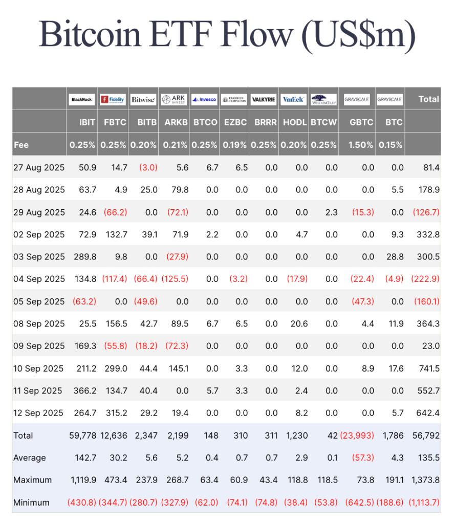 The turnaround began on Sep. 8, when ETFs posted $364 million in net inflows. A smaller print of $23 million followed on Sep. 9, before momentum accelerated midweek: $741 million on Sep. 10, $553 million on Sep. 11, and $642 million on Sep. 12. Inflows were spread across major products, with BlackRock’s IBIT, Fidelity’s FBTC, and Ark’s ARKB absorbing the bulk of allocations.