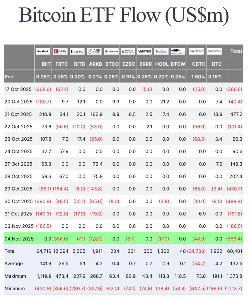 Spot Bitcoin ETFs saw a sharp $566.4 million outflow on Tuesday, Nov. 4, extending its five-day drain to roughly $1.9 billion and decisively flipping the week’s tone into risk-off.